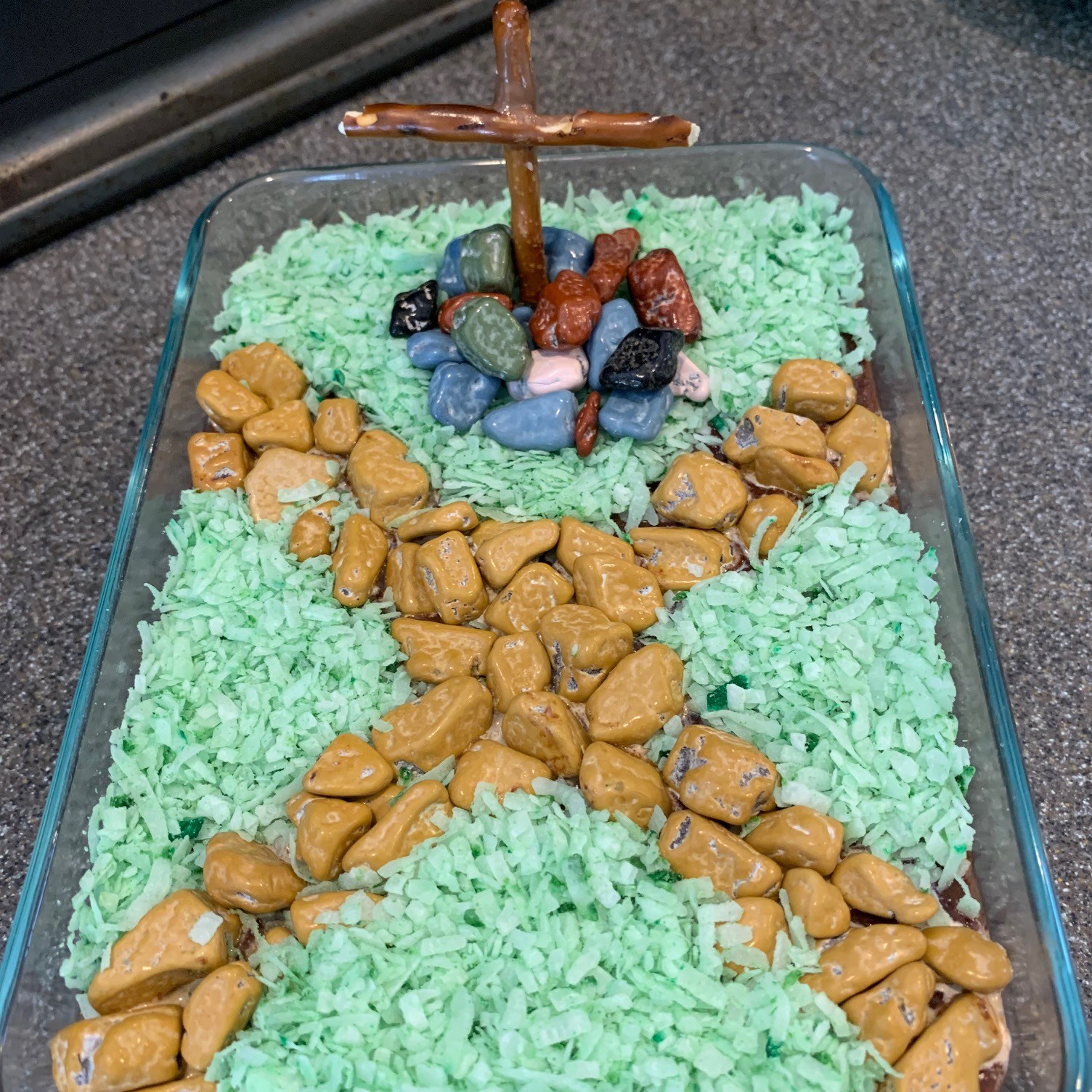 To make this Crossroads-inspired piece, I used chocolates from my local market that are candy-coated to look like rocks. My daughter and I picked out the brown rocks and then arranged them on top of the pudding to make the crossroads. We filled the rest of the surface in with the coconut shavings to make the grass. I made the memorial by piling rocks around a cross made of pretzel sticks, glued together by melted chocolate.