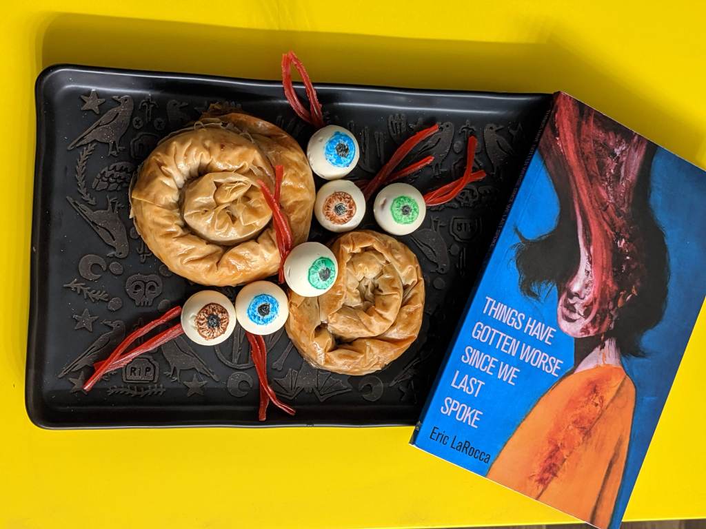 There are three things that immediately come to mind when I think about this book: eyeballs, apples, and tapeworms. So, my dark little heart decided it wanted to make caramel-apple butter “eyeball” truffles and crispy, crunchy “tapeworm” baklava. Yummy!