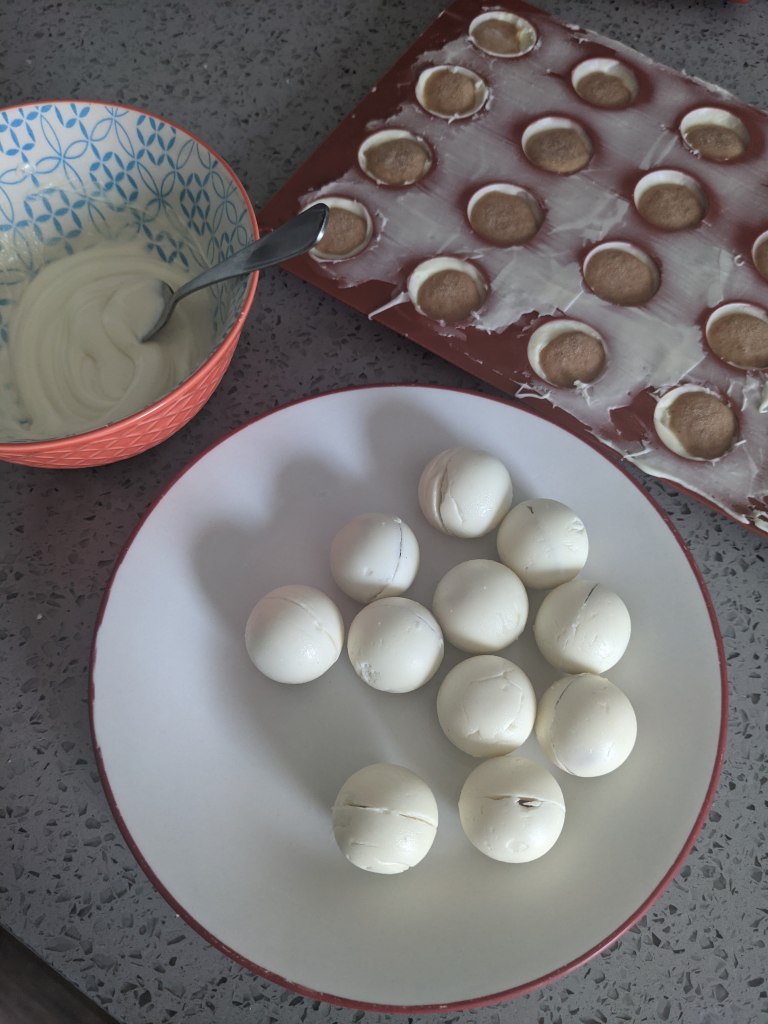 I used Ghirardelli white chocolate chips to create the chocolate shells for these truffles, and I found the tempering method outlined on the Fat Daddio’s website above really helpful. For my first batch, I melted ¾ cup of chocolate in the microwave (in 20 second increments and stirring in between) and then added another ¼ cup of chocolate and stirred, stirred, stirred for about seven minutes to get the chocolate to the right temperature and consistency (see the details on the Fat Daddio’s webpage). If you’re going to pipe the melted chocolate into your silicone molds, work fast! Halfway through, my chocolate started hardening, and it was no longer pipeable. But it was still soft enough to work with, so I started pressing the chocolate into the molds with a spoon, and that worked out just fine! If, like me, these are your first truffles, don’t be afraid to create thicker chocolate shells. They’ll be easier to work with, and you can always finesse your chocolate work and get fancy down the line.